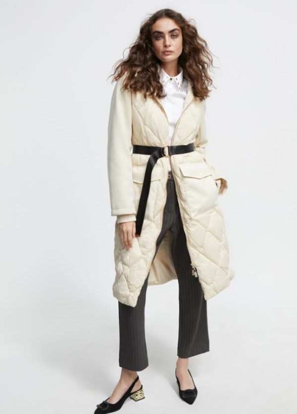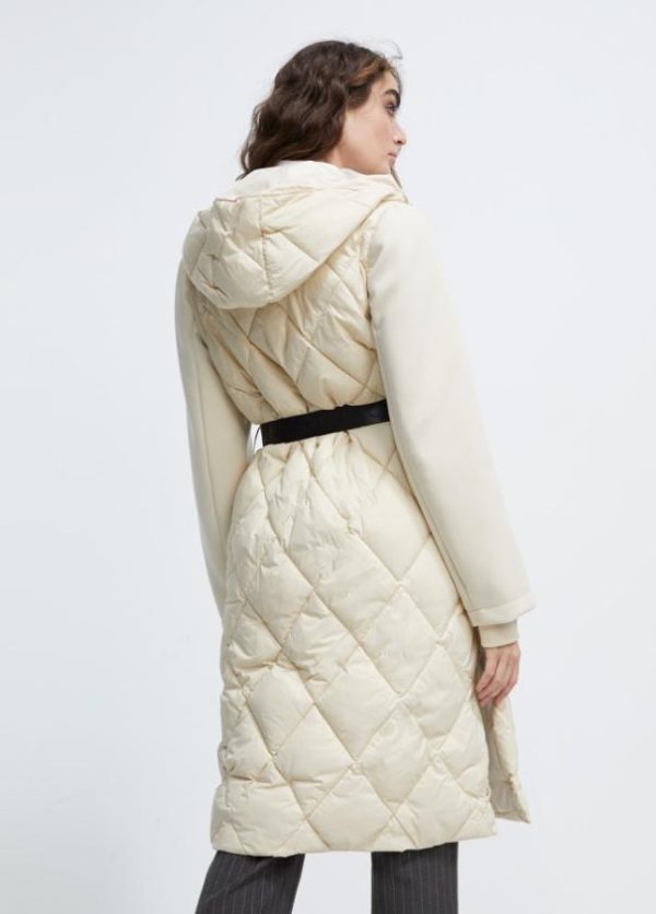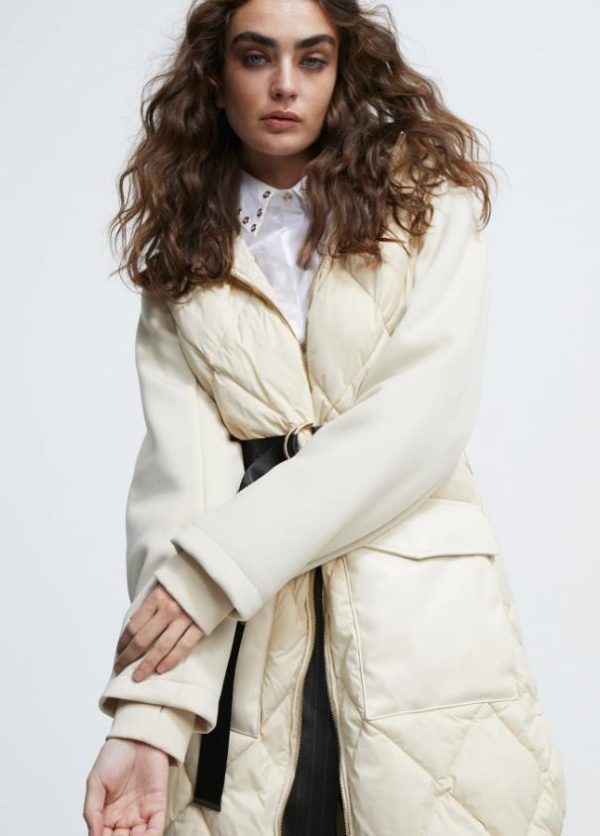 Abrigo de largo midi con capucha. Frontal y espalda acolchados y mangas en tejido escoba. Bolsillos frontales tipo plastrón con tapete en efecto piel a tono. Cierre con cremallera de doble carro y cinturón contrastado.
