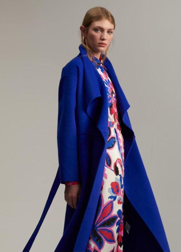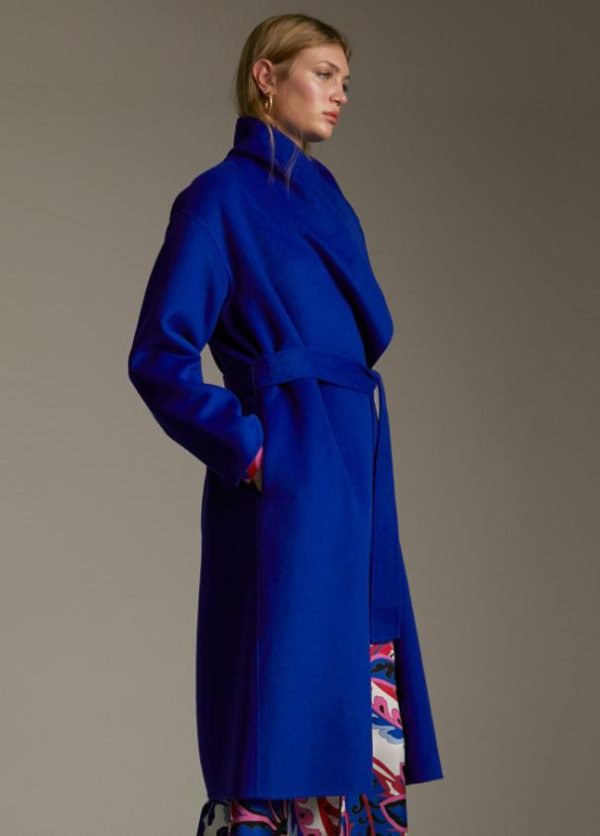 Abrigo handmade monocolor de largo midi. Maxi solapa. Bolsillos laterales y cinturón del mismo tejido y color.