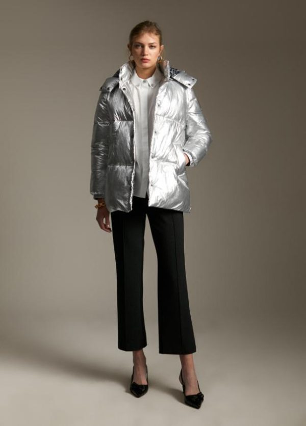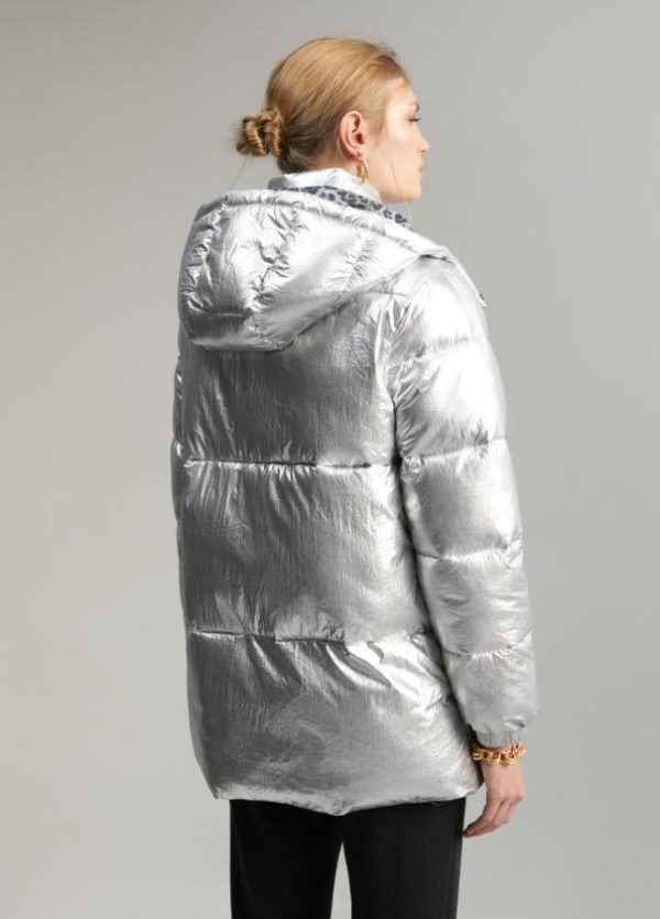 Anorak acolchado metalizado y con capucha extraíble. Forro en animal print a tono. Cerrado con snaps metálicos y bolsillos laterales. Puños elásticos.