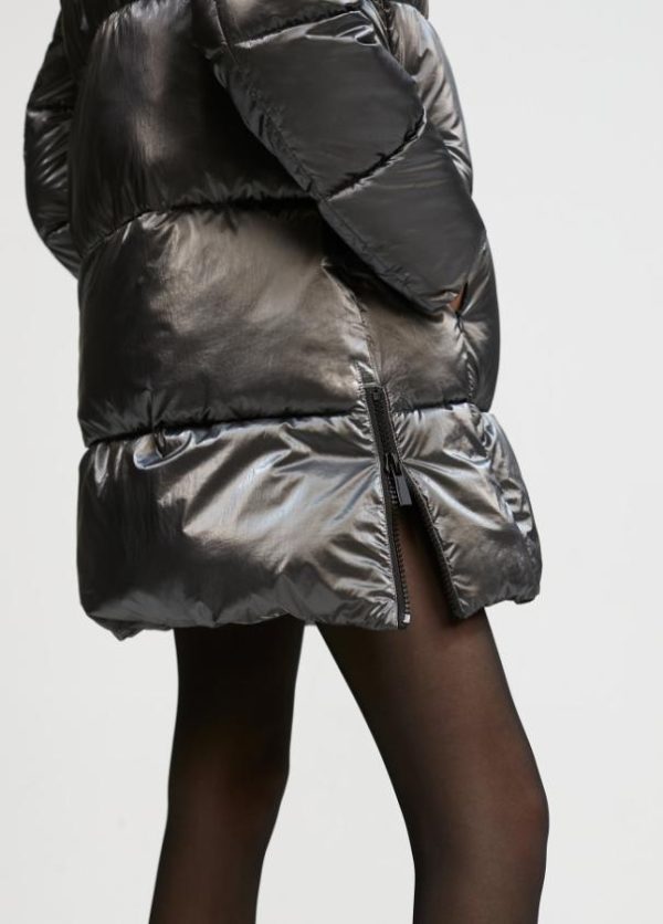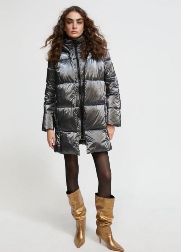 Chaqueta acolchada con capucha efecto metalizado. Cerrada con cremallera frontal. Bolsillos laterales. Puños tipo mitones en punto. Aberturas laterales con cremallera.
