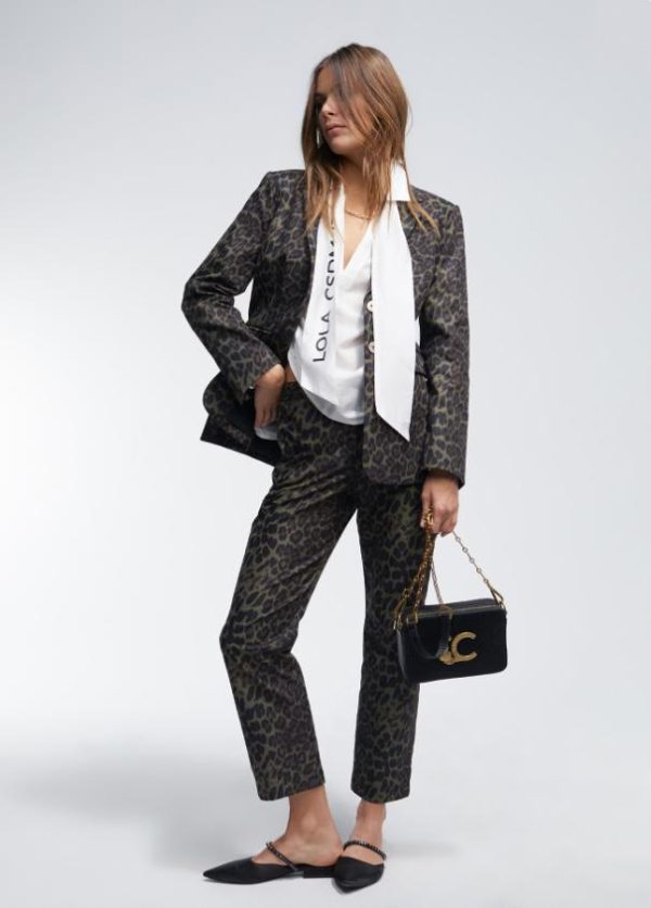 Blazer estampada en animal print. Cuello solapa y cerrada con botones metálicos dorados. Bolsillos tapete y vivo en frontal.