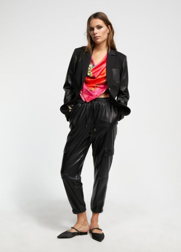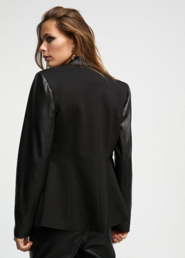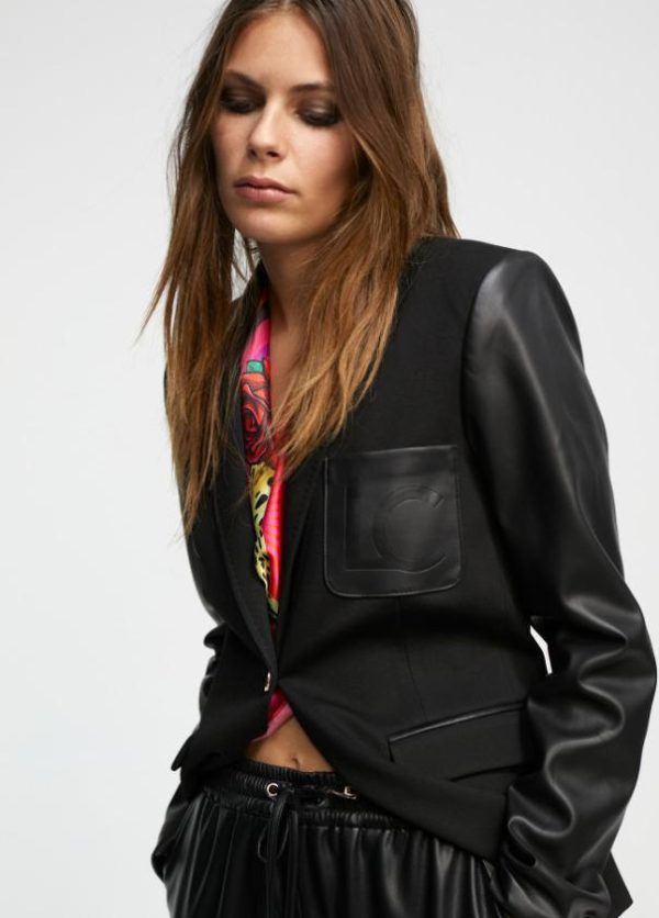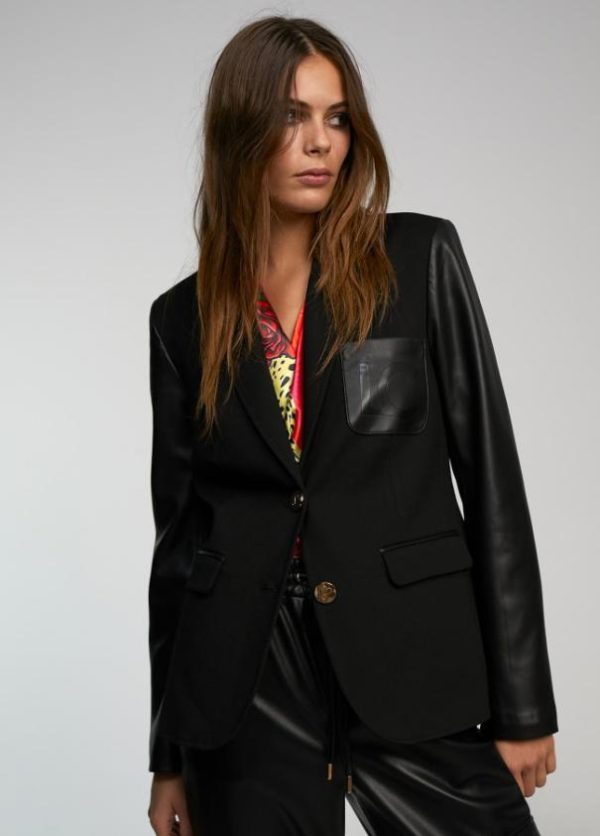 Blazer combinada con efecto piel a tono en mangas y bolsillo frontal. Cuello solapa y cerrada con botones metálicos en dorado. Bolsillos con tapete.