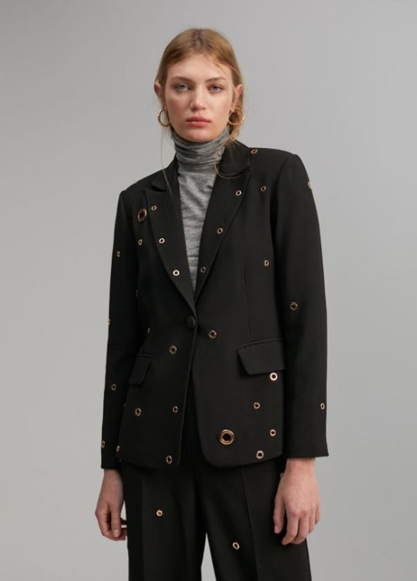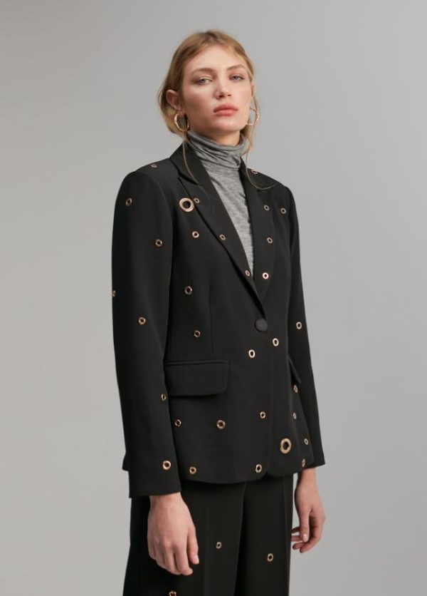 Blazer con eyelets metálicos en dorado. Cuello solapa, tapetes frontales y cerrada con botón.