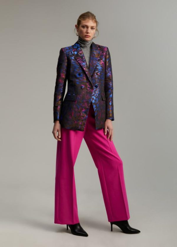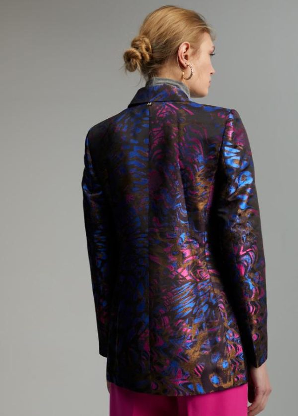 Blazer cruzado en jacquard estampado efecto tornasolado. Cuello solapa y con botones forrados del mismo tejido. Tapete con vivo en laterales.