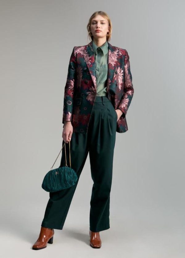 Blazer cruzada en jacquard estampado floral. Cuello solapa y botones forrados del mismo tejido. Tapetes frontales. Forro en estampado animal print.