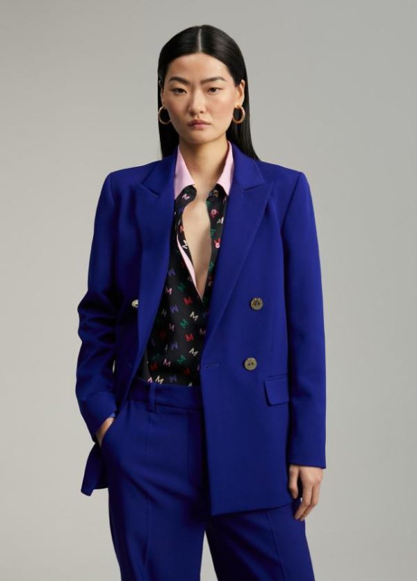 Blazer recta con botones frontales en dorado. Cuello solapa y bolsillos laterales con tapete. Detalle de botones en puños.