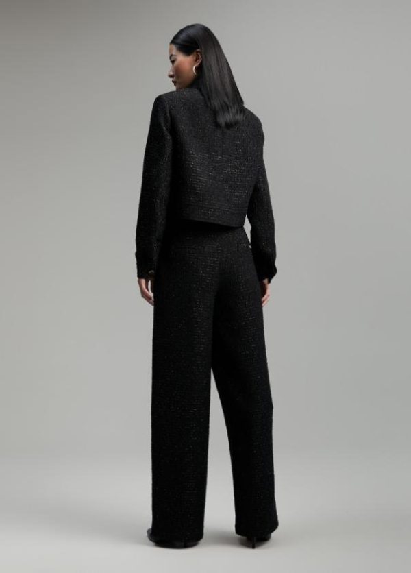 Chaqueta tweed cropped cerrada con snaps metálicos ocultos. Cuello y puños camiseros. Bolsillos frontales superiores tipo plastrón con tapete.