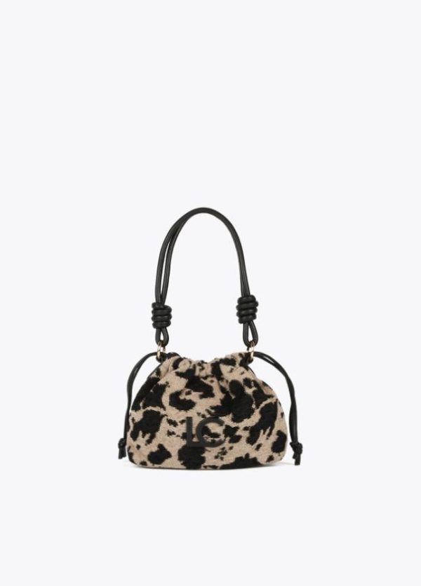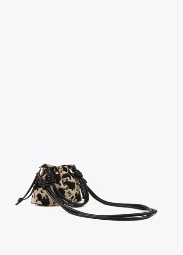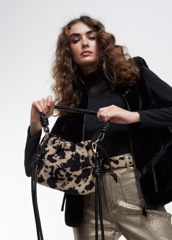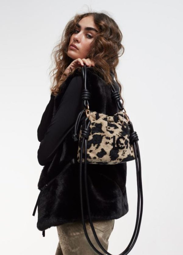Bolso tipo bandolera de tejido animal con detalles dorados. Asa de hombro y asa bandolera extraíble. Cierre con cordón ajustable.