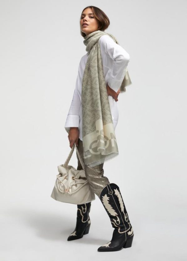Fular en tonos crudos logotipado y con estampado corazones infinitos.