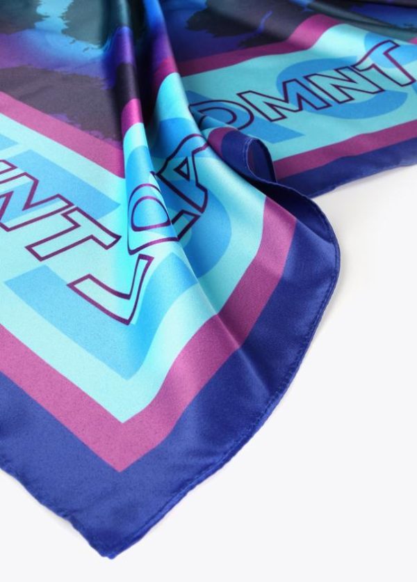 Pañuelo logotipado y combinado con estampado animal en tonos azules.