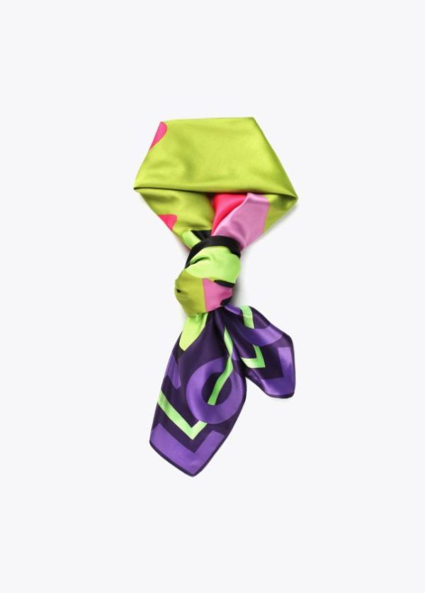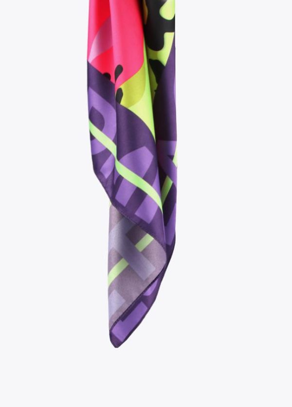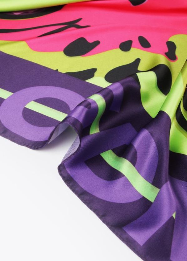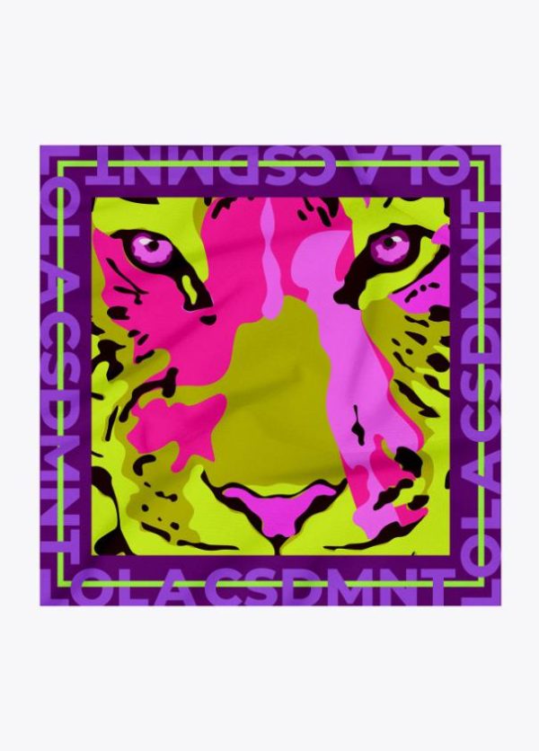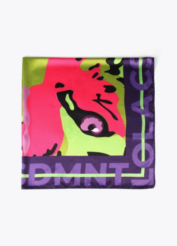 Pañuelo satinado logotipado combinado con cara animal en colores flúor en parte central.