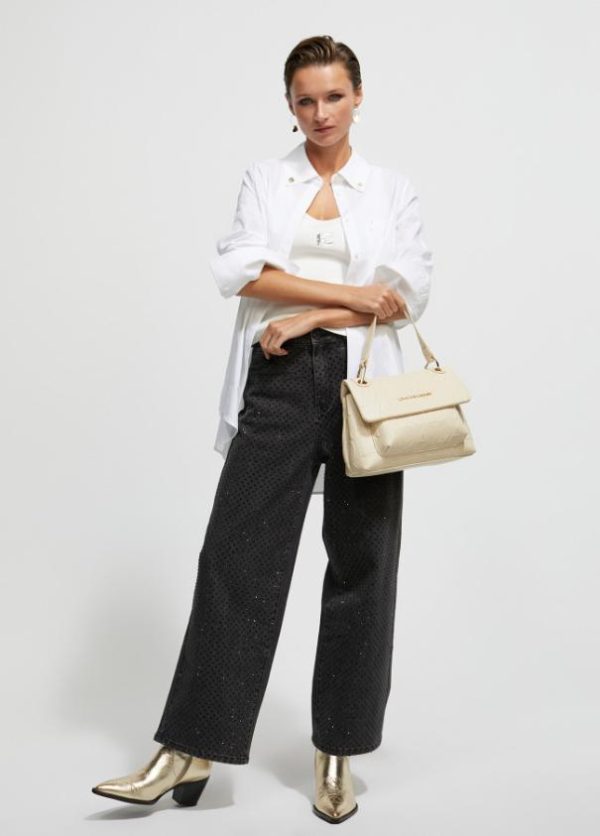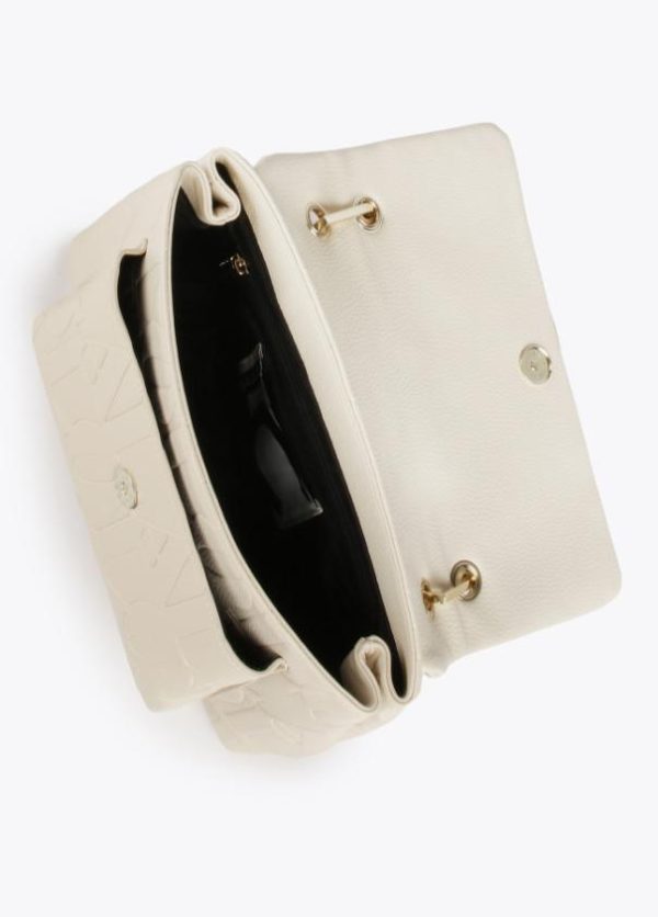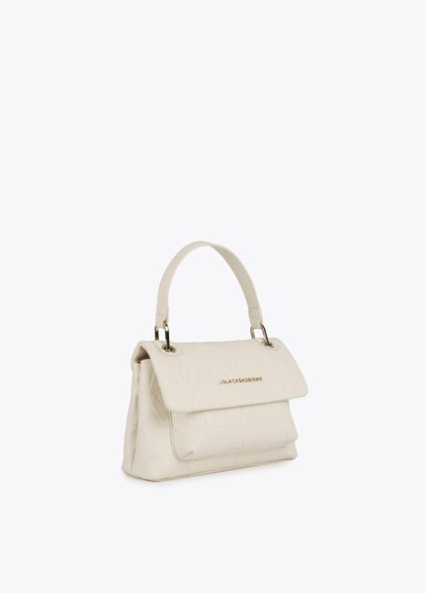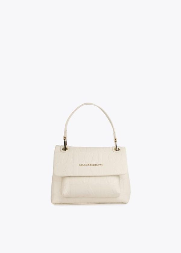 Bolso tipo bandolera en efecto piel grabada y logo en parte frontal. Asa de mano y asa bandolera extraíble. Cierre con botón imantado y bolsillo interior.