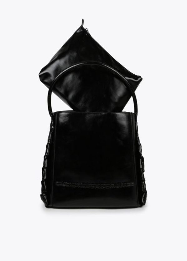 Bolso shopper en efecto piel. Detalles laterales trenzados y frontal con letras metálicas. Contiene pequeño bolsito interior. Cierre con imán.