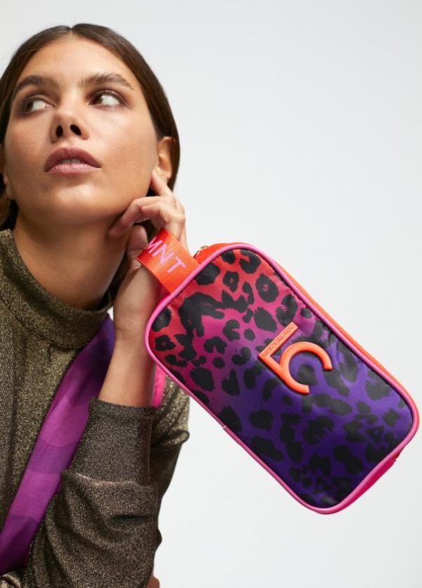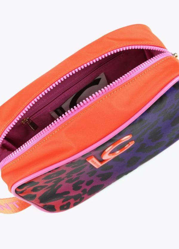 Neceser con estampado animal multicolor y detalles color naranja. Logo lacado en parte frontal.