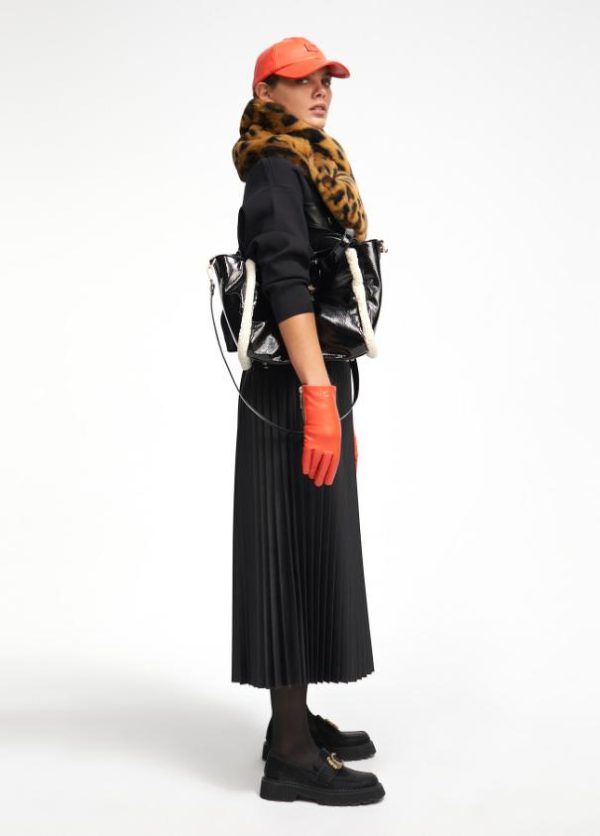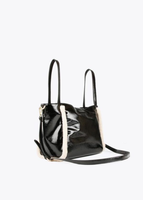 Bolso en formato shopper con efecto piel. Asas de hombro y asa ajustable en estilo bandolera. Detalle de tejido exterior combinado en borreguito. Cierre metálico mediante lengüeta dorada logotipada.