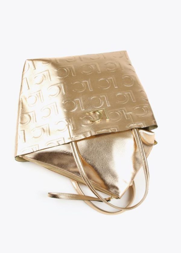 Bolso tipo shopper en efecto piel metalizado y con monograma grabado. Logo en zona frontal y cierre con botón imantado. Bolsito neceser interior logotipado con cremallera.