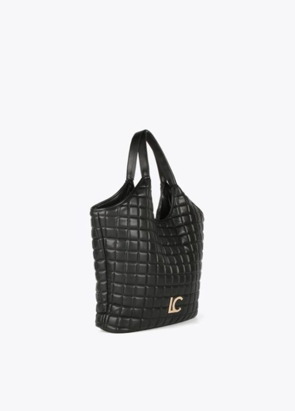 Bolso tipo shopper acolchado de cuadros con mega logo dorado en parte frontal. Cierre con botón imantado en lengüeta y detalle bolsito interior.