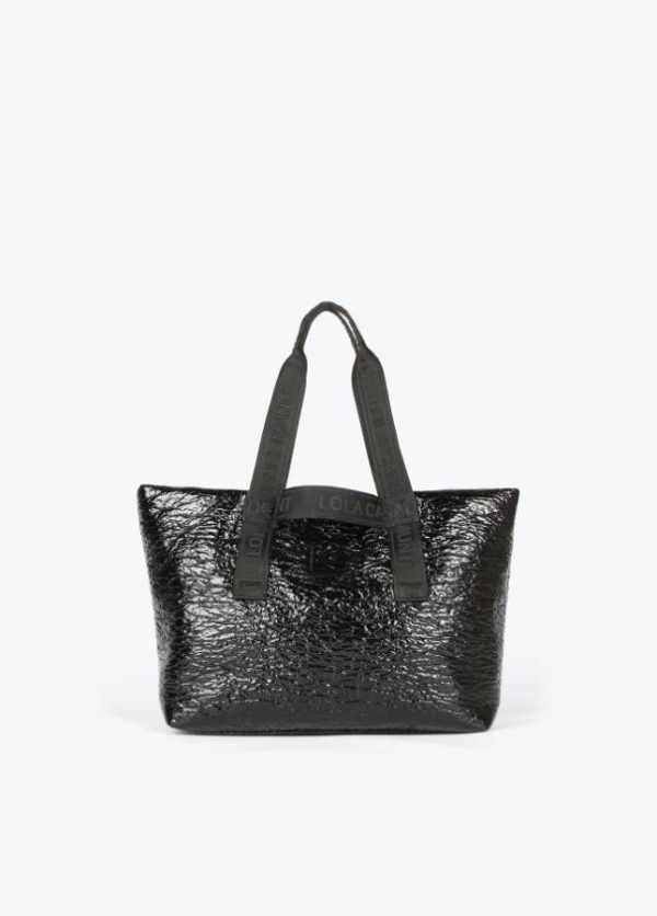 Bolso tipo shopper efecto charol arrugado con asas al tono logotipadas. Cierre con lengüeta y botón clic y detalle bolsito neceser interior.