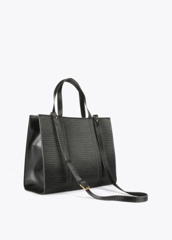 Bolso tipo shopper en efecto piel cocodrilo. Mega logo animal dorado en parte frontal. Asas de hombro y asa bandolera. Bolsito neceser interior logotipado.