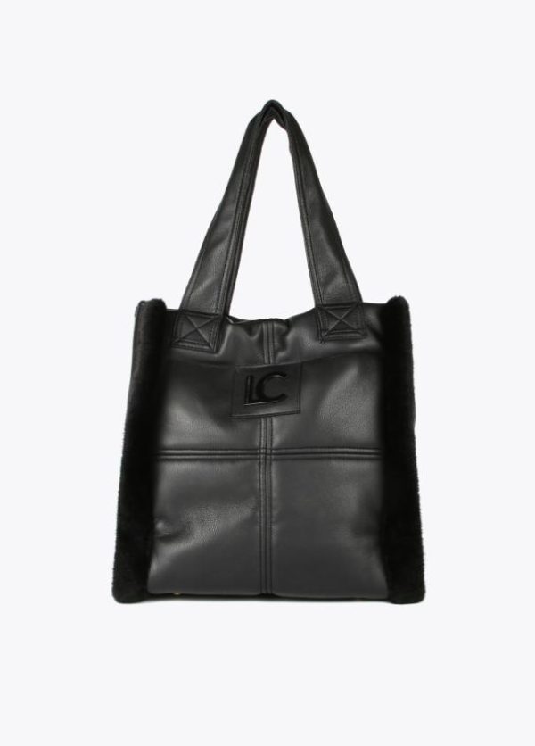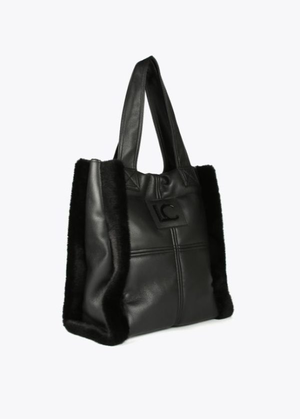 Bolso tipo shopper en efecto piel y efecto pelo combinados. Logo lacado en parte frontal, asa de hombro y cierre con botón imantado.