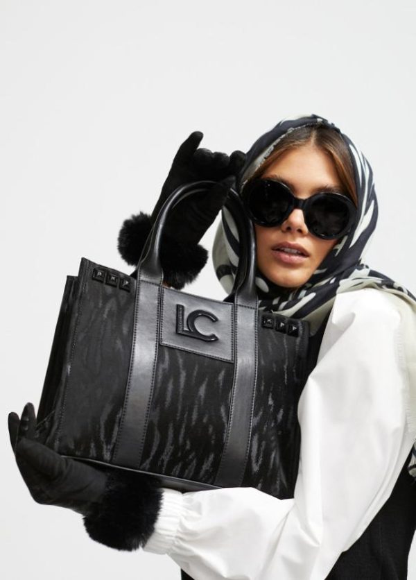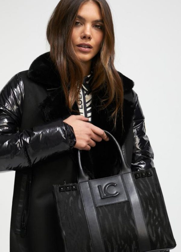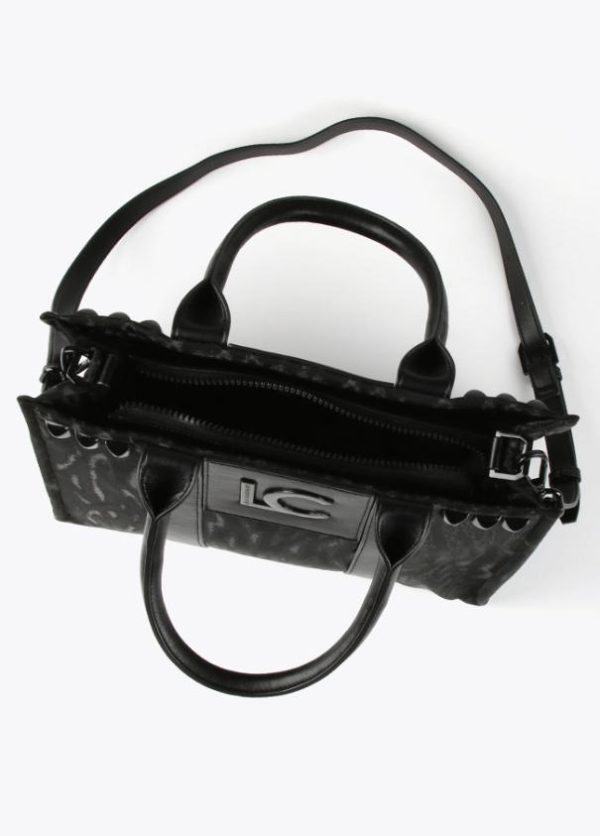 Bolso tipo shopper con estampado de zebra al tono y mega logo lacado en parte frontal. Asas de mano y detalles en efecto piel y cierre de cremallera.