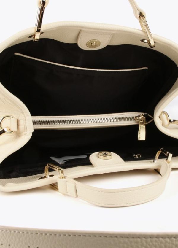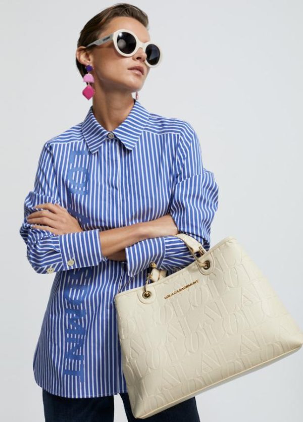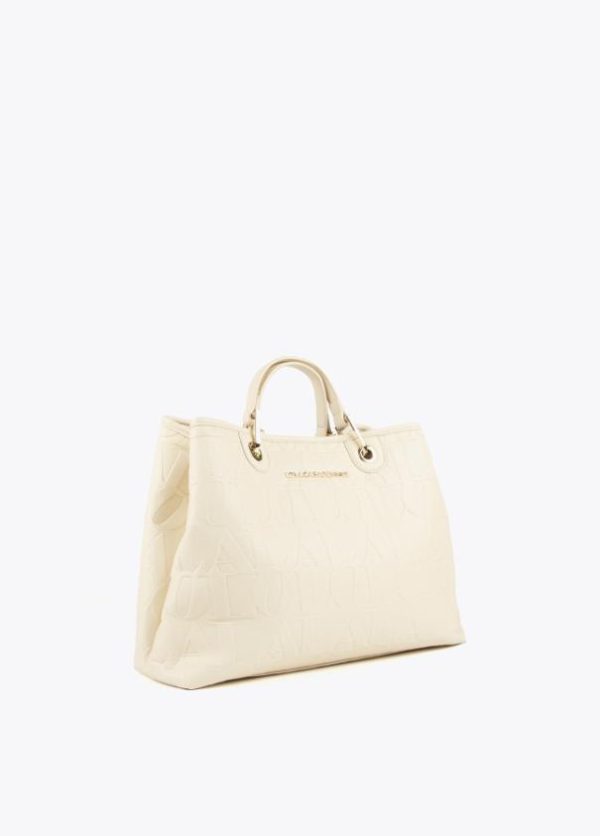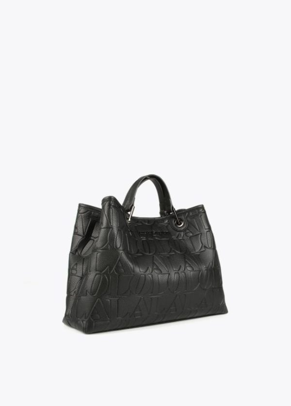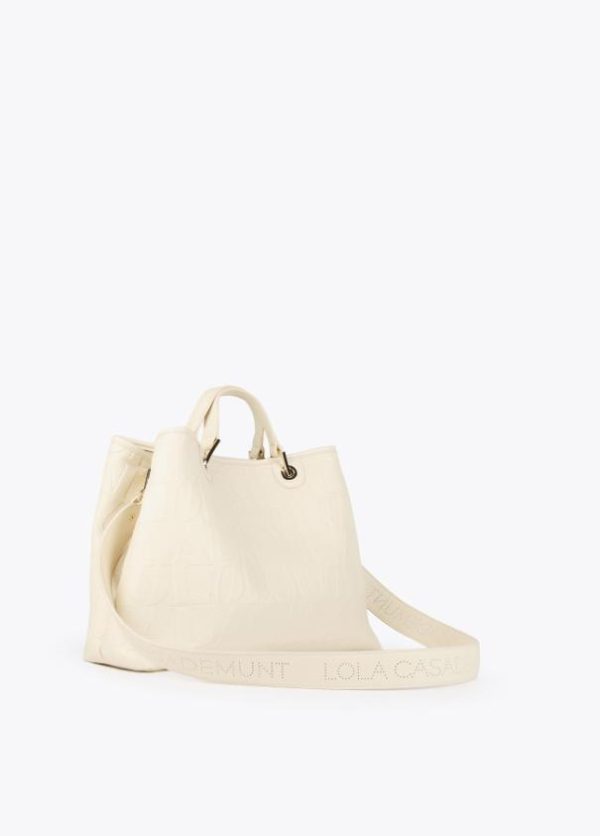 Bolso tipo shopper grabado en efecto piel y logo en parte frontal. Asas de mano y asa bandolera ajustable y extraíble. Cierre con botón imantado en lengüeta.
