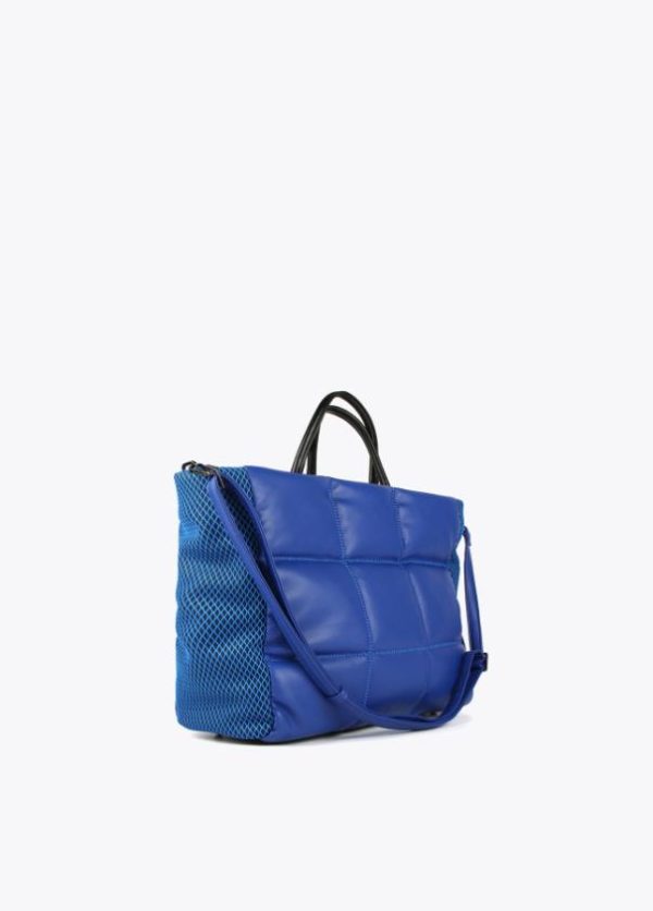 Bolso tipo shopper acolchado en efecto piel en color azul y negro combinados. Asas de mano y asa bandolera ajustable y extraíble. Cierre de cremallera.
