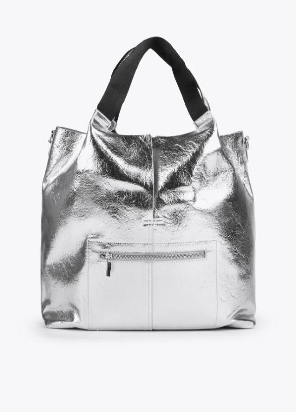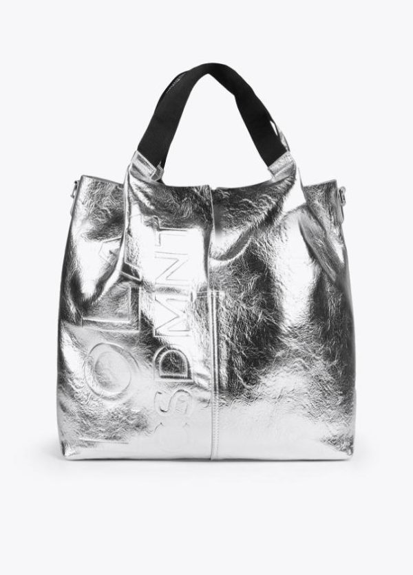 Bolso tipo shopper metalizado con detalle logo en relieve. Asas de hombro y asa bandolera logotipadas. Bolsillo exterior con cremallera y bolsito neceser interior logotipado.