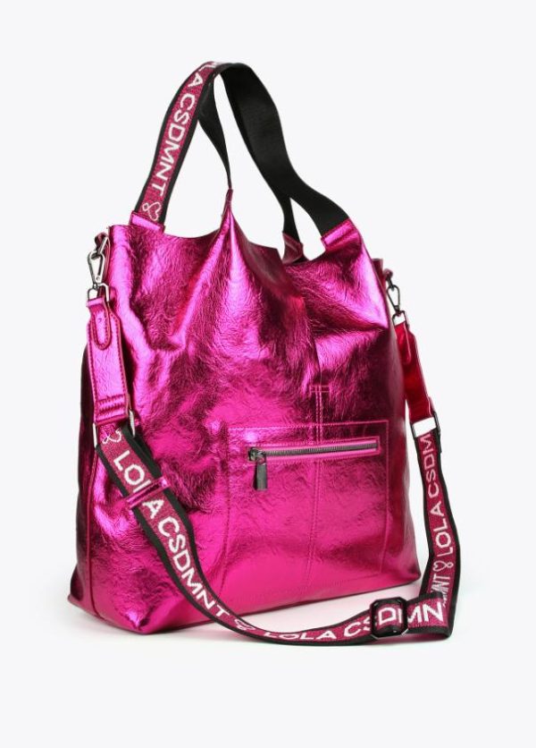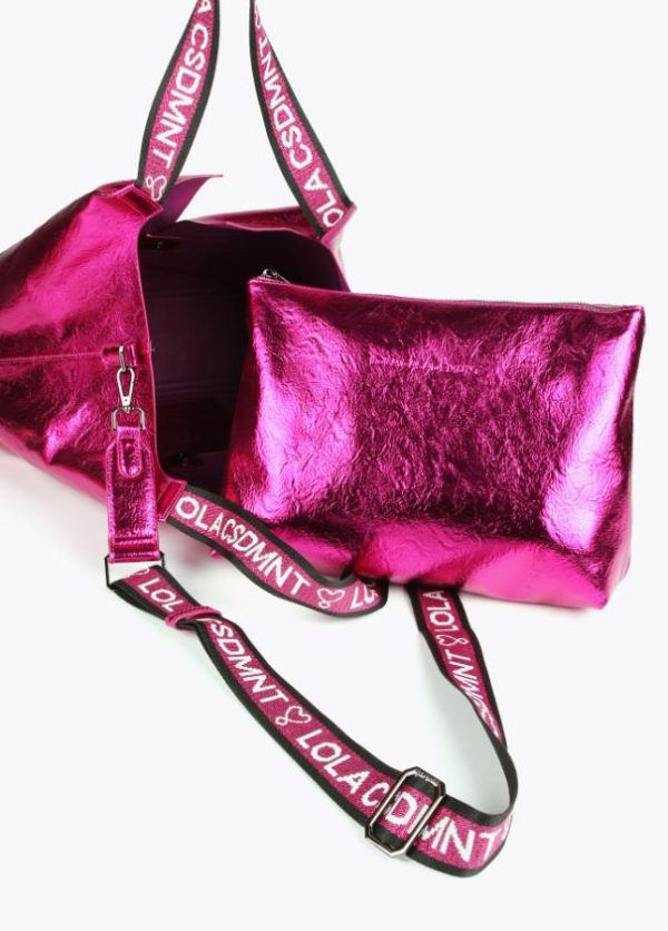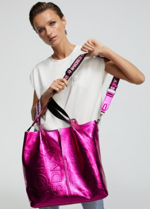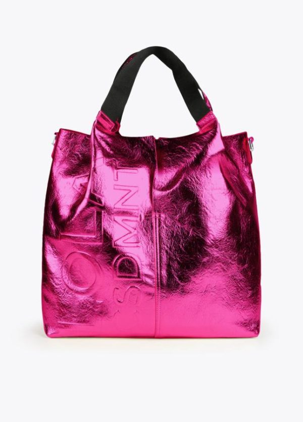 Bolso tipo shopper metalizado con detalle logo en relieve. Asas de hombro y asa bandolera logotipadas. Bolsillo exterior con cremallera y bolsito neceser interior logotipado.