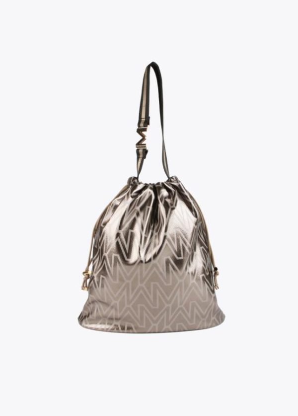 Bolso shopper tipo saco con estampado monograma. Asa con letra logo dorada y cierre con cordón ajustable.