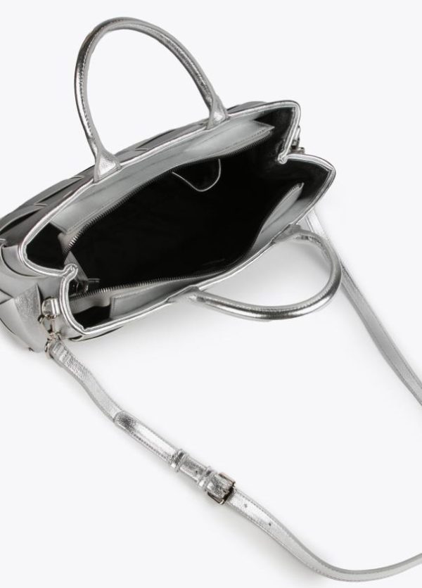 Bolso tipo shopper trenzado en efecto piel y logotipo grabado en parte frontal. Asas de mano y asa bandolera extraíble. Cierre con cremallera.
