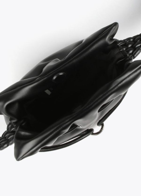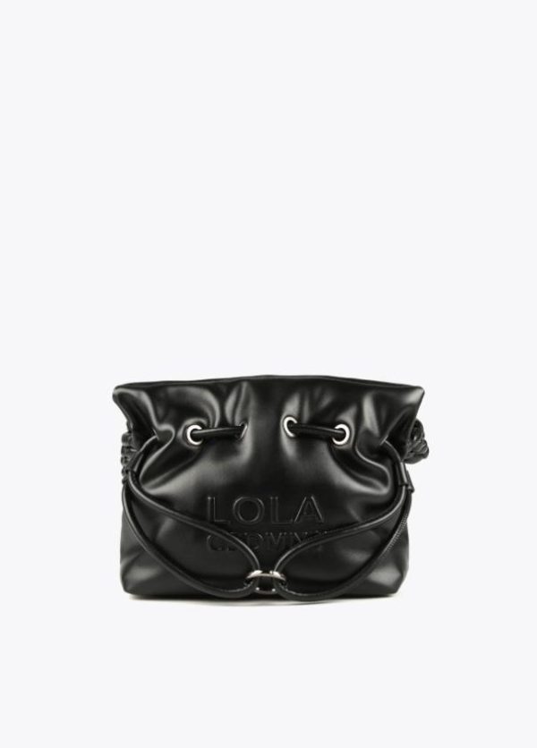 Bolso tipo bandolera en efecto piel con logo en relieve en parte frontal. Asa bandolera trenzada, cordón ajustable y cierre con botón imantado.