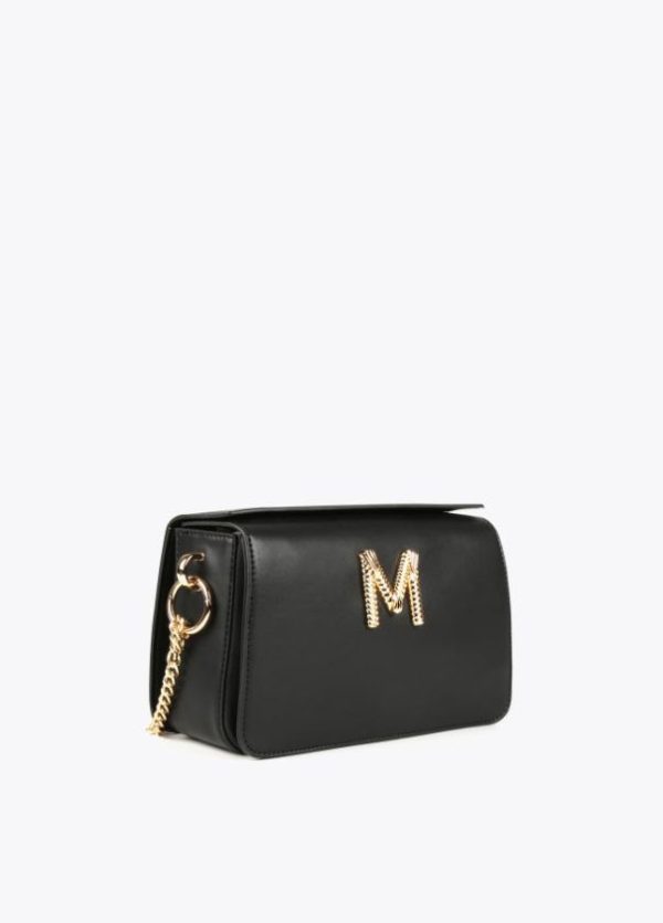 Bolso bandolera rectangular con asa de cadena extraíble. Cierre con botones imantados y detalle letra logo dorada en parte frontal.
