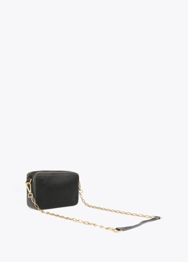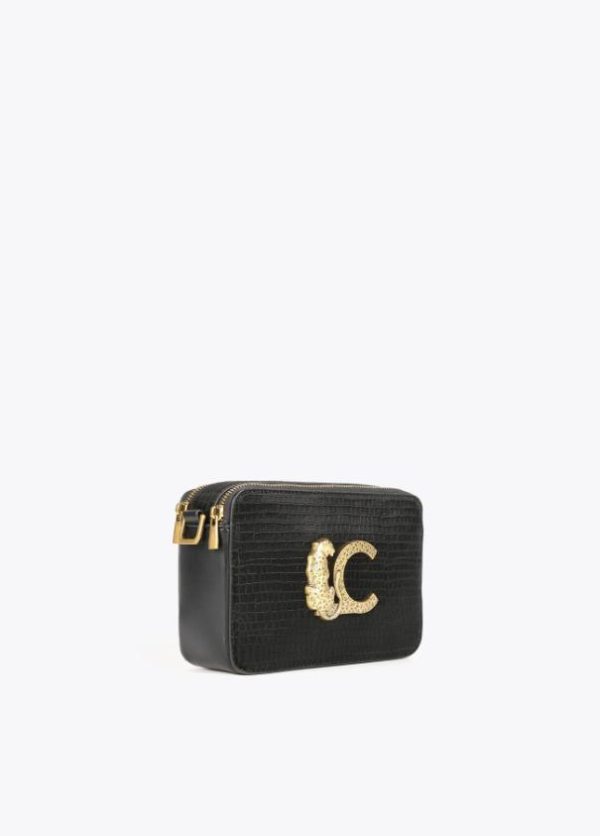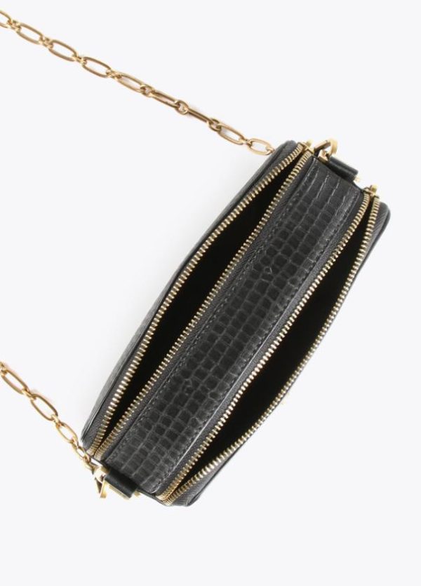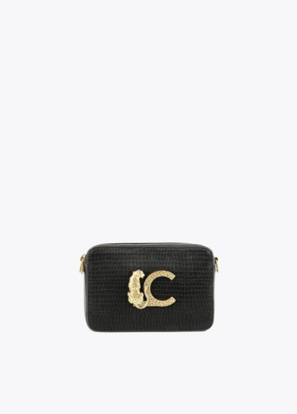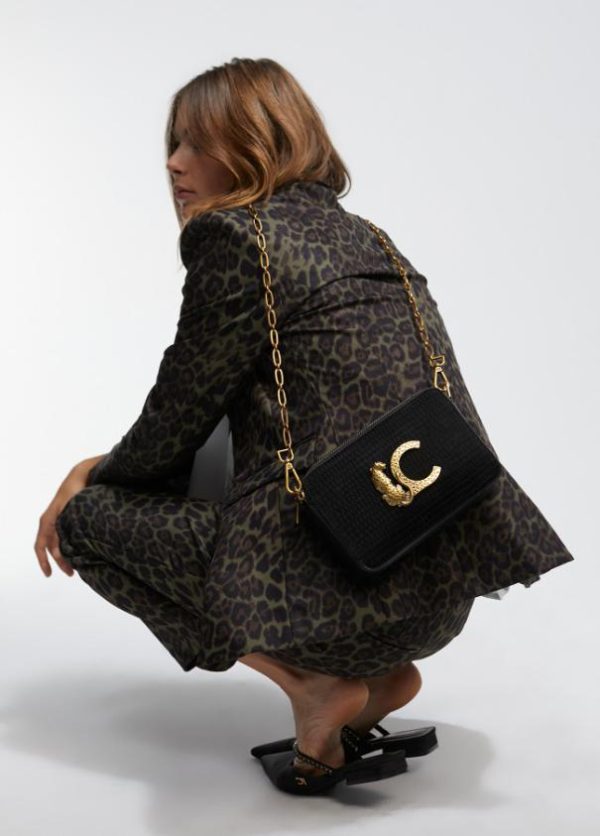 Bolso tipo bandolera en efecto piel cocodrilo y mega logo animal dorado en parte frontal. Doble cierre de cremallera y asa bandolera de cadena dorada.