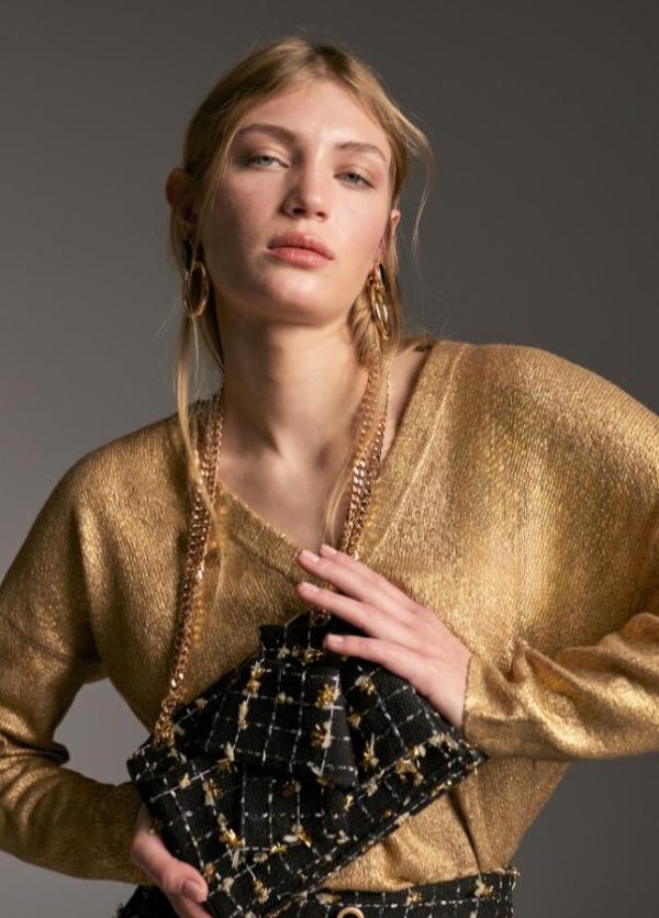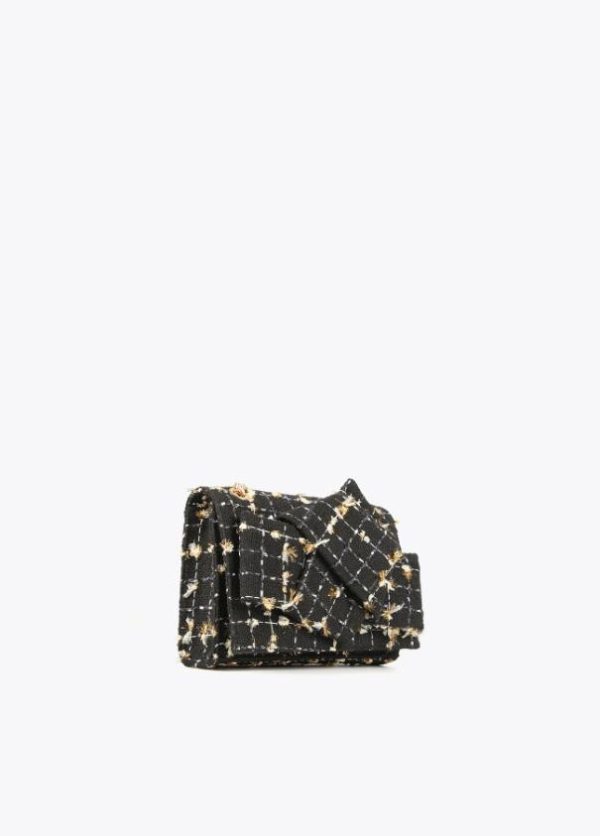 Bolso en formato bandolera de tejido en tweed. Combinación de color negro con detalles dorados. Asa de hombro convertible en cadena metalica dorada.Cierre con botón.