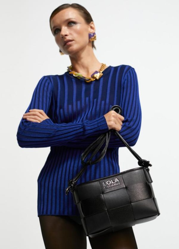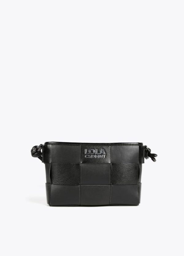 Bolso tipo bandolera trenzada en efecto piel y logotipo grabado en parte frontal. Asas de mano y asa bandolera extraíble. Cierre con cremallera.