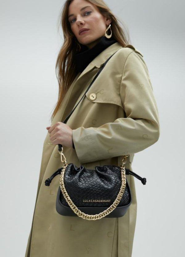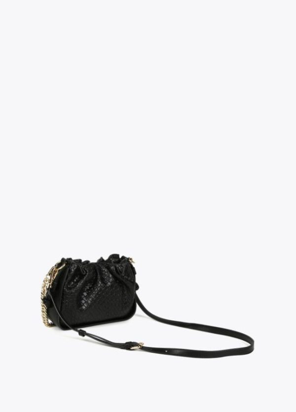 Bolso bandolera con detalles de material trenzado en efecto piel. Detalle de cadena en dorado. Contiene pequeño bolsillo interior y asa larga ajustable. Cierre ajustable con cordón.