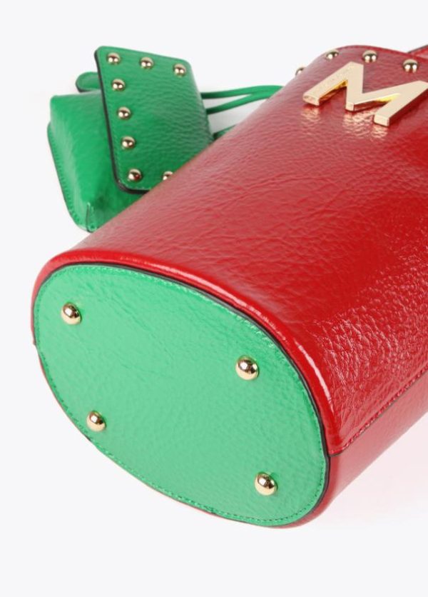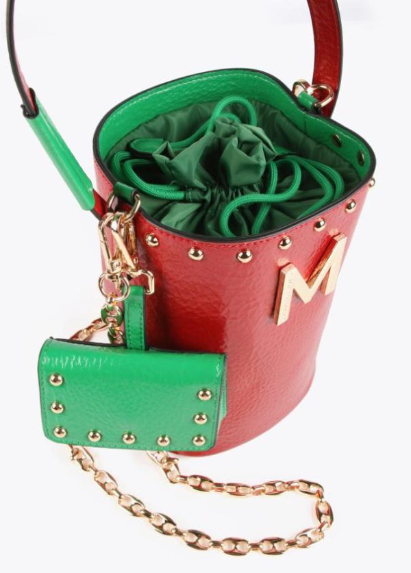 Bolso tipo bombonera con asa de mano y asa bandolera dorada. Cierre con cordón ajustable en saco protector. Detalle monedero exterior extraíble y letra logo dorada en parte frontal.
