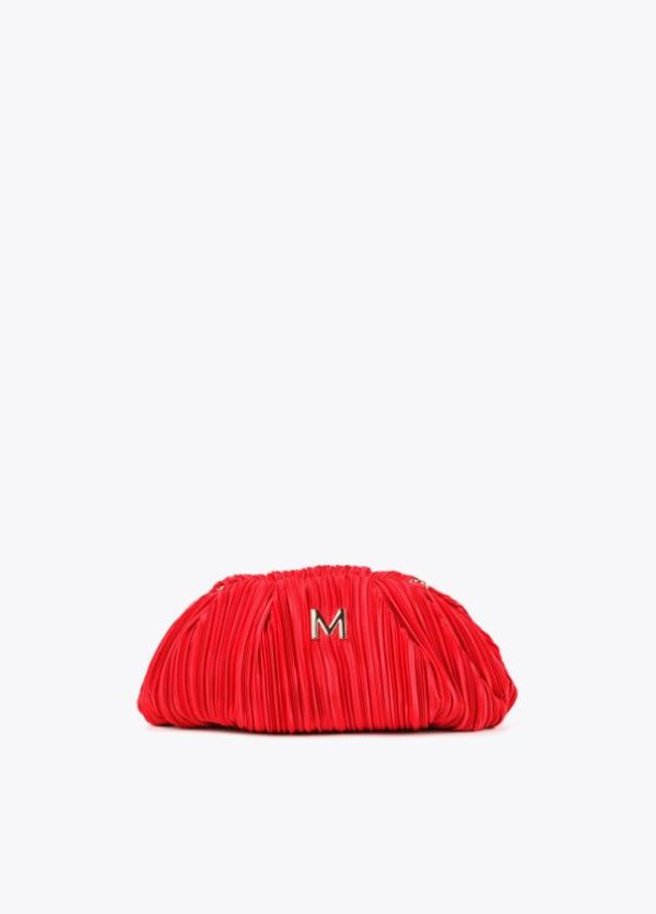 Bolso de fiesta con forma de concha plisado con cadena dorada extraíble. Detalle letra logo dorada en parte frontal.