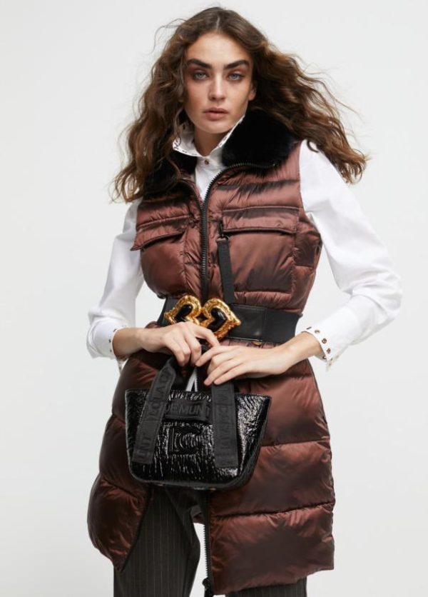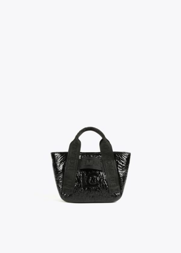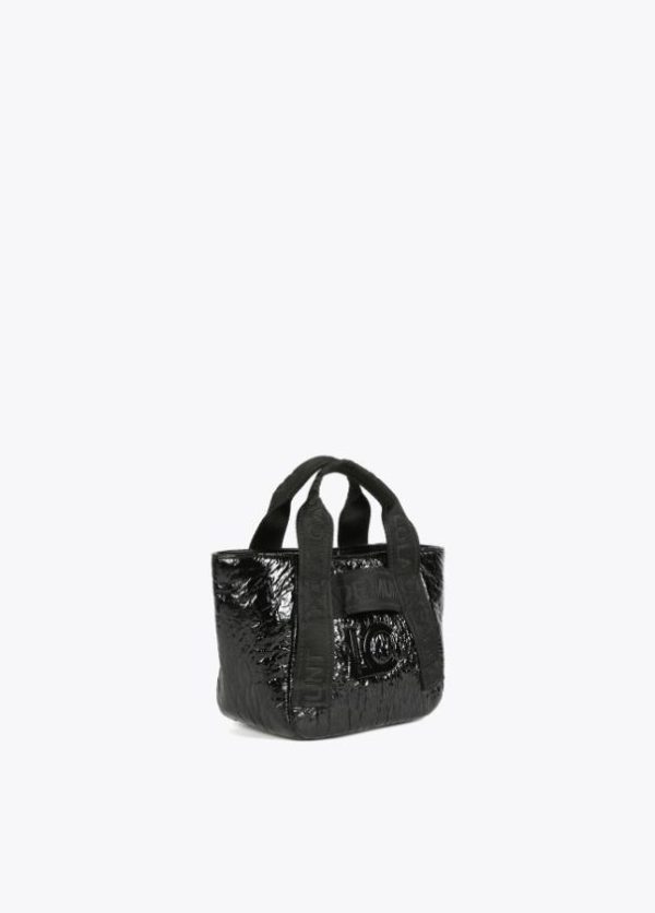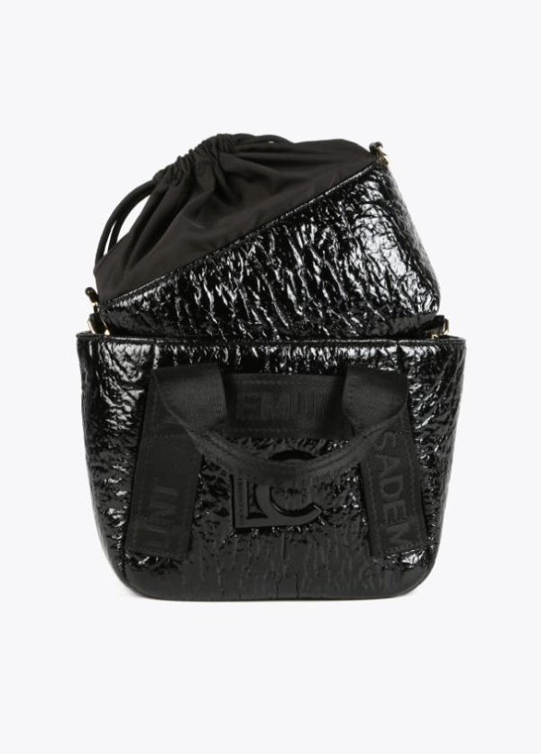 Bolso tipo mini bandolera en efecto charol arrugado y asas logotipadas. Asa bandolera ajustable y extraíble y bombonera interior con cierre de cordón.