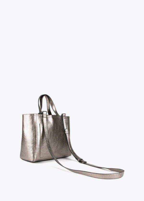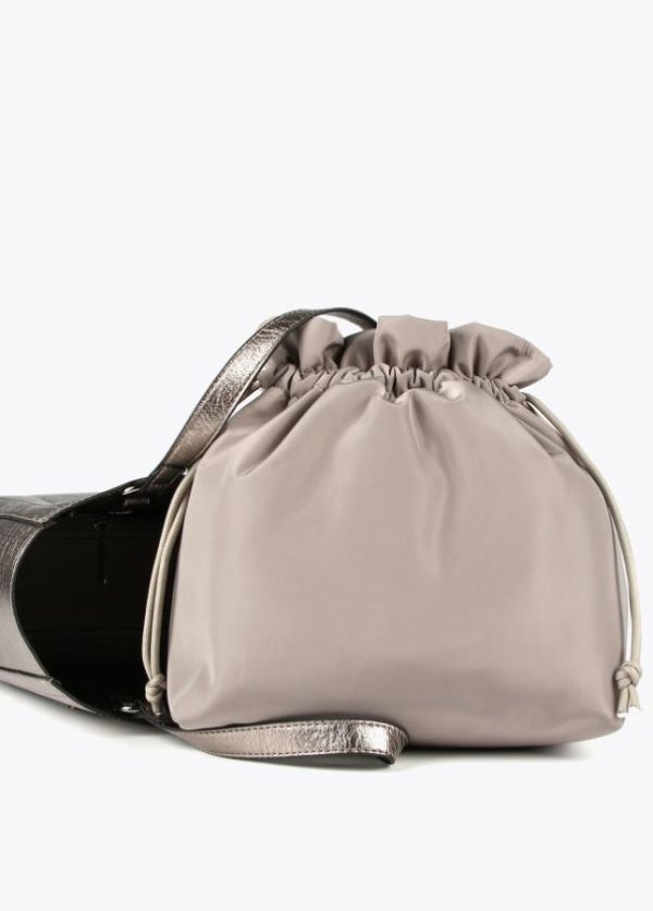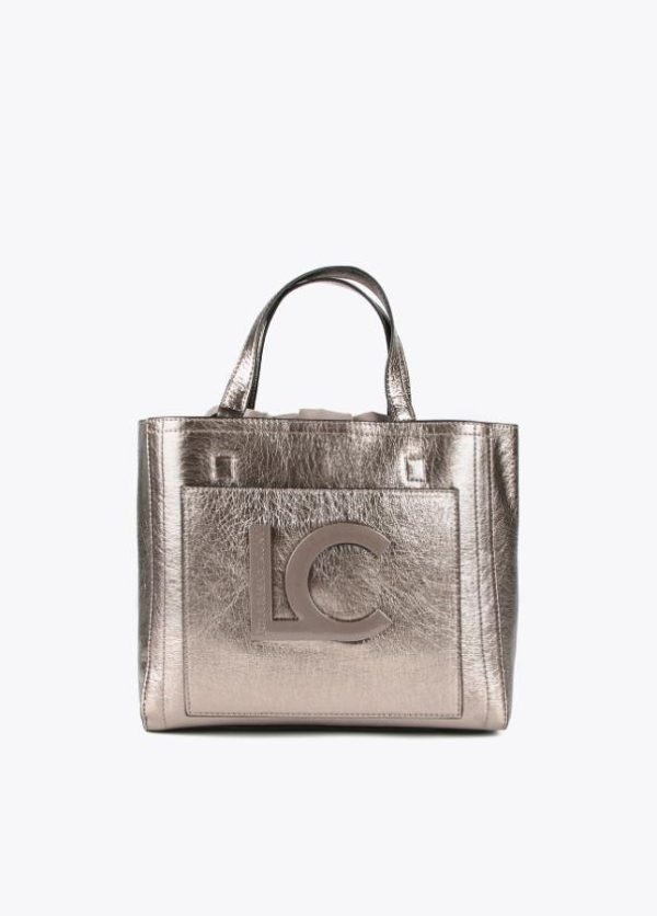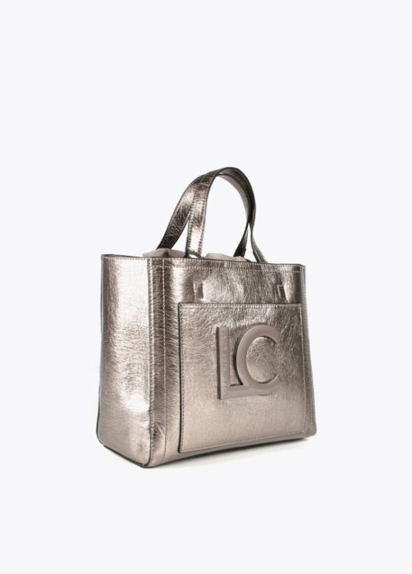 Bolso tipo mini shopper con mega logo lacado en parte frontal. Asas de mano y asa bandolera regulable y extraíble. Saco interior con cierre de cordón y cierre con botón imantado.
