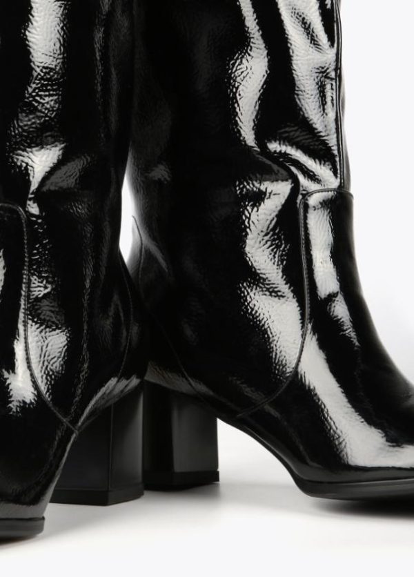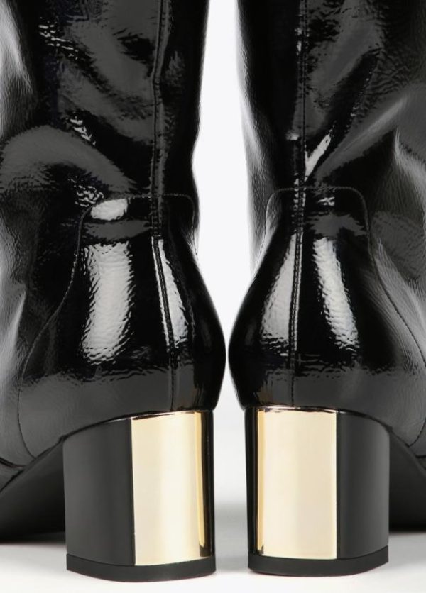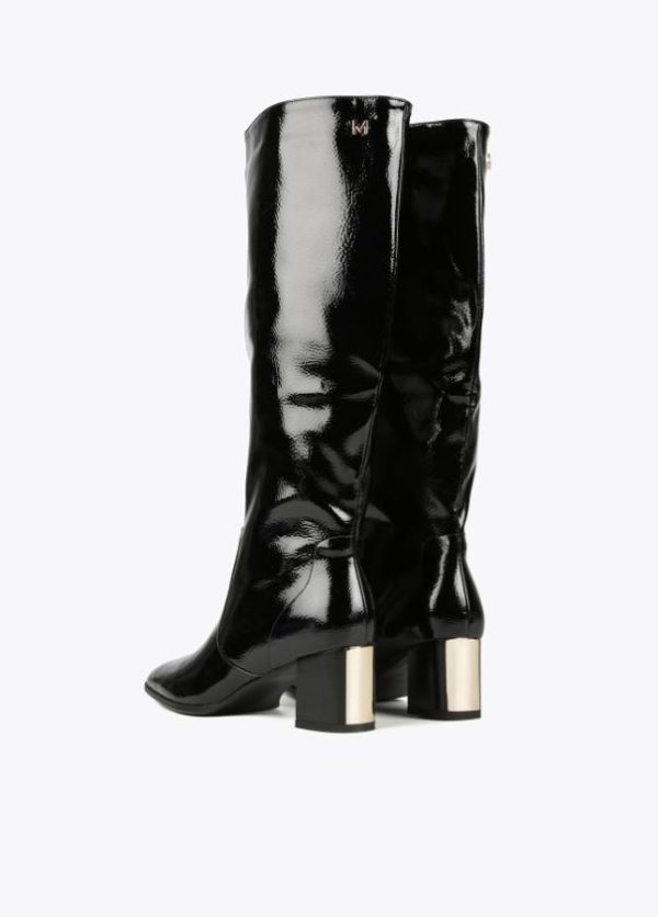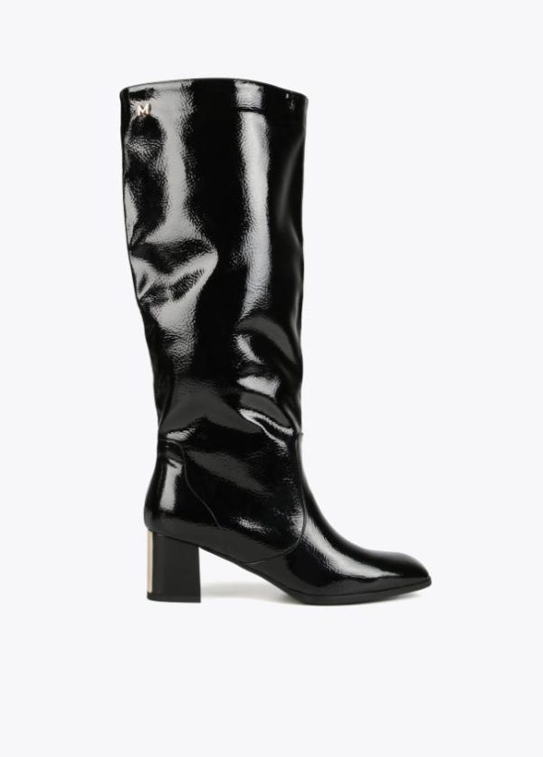 Bota de caña alta en efecto charol con letra logo dorada en el lateral.