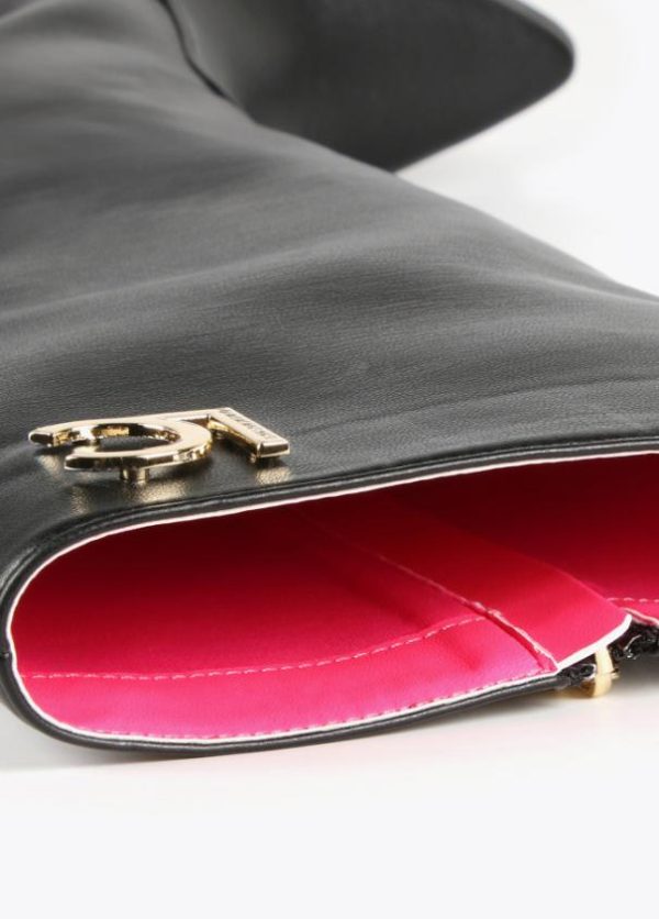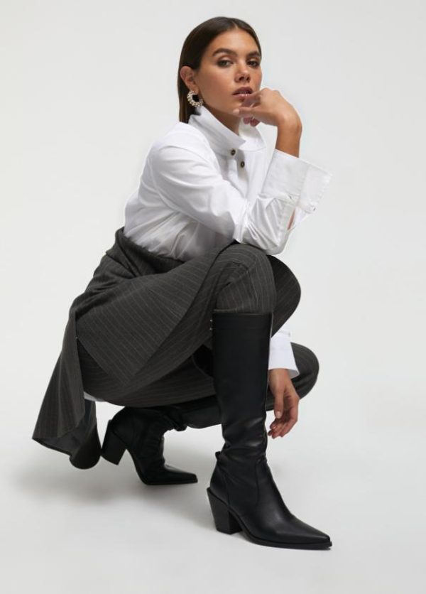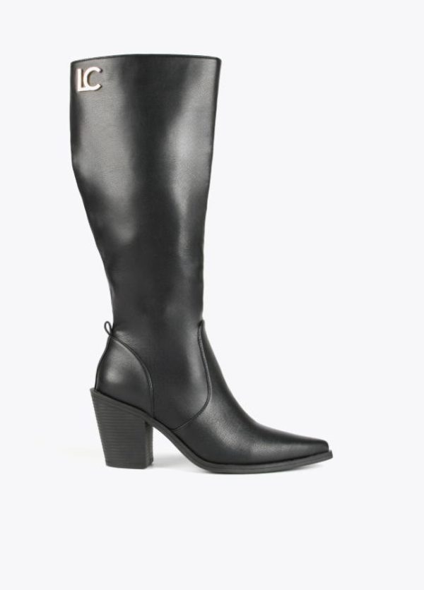 Bota negra de caña alta estilo cowboy con tacón. Cierre con cremallera en parte interior. Detalle letras logo doradas.