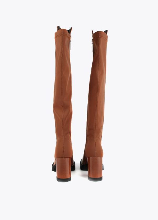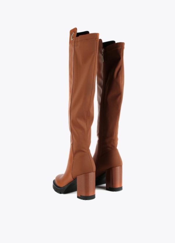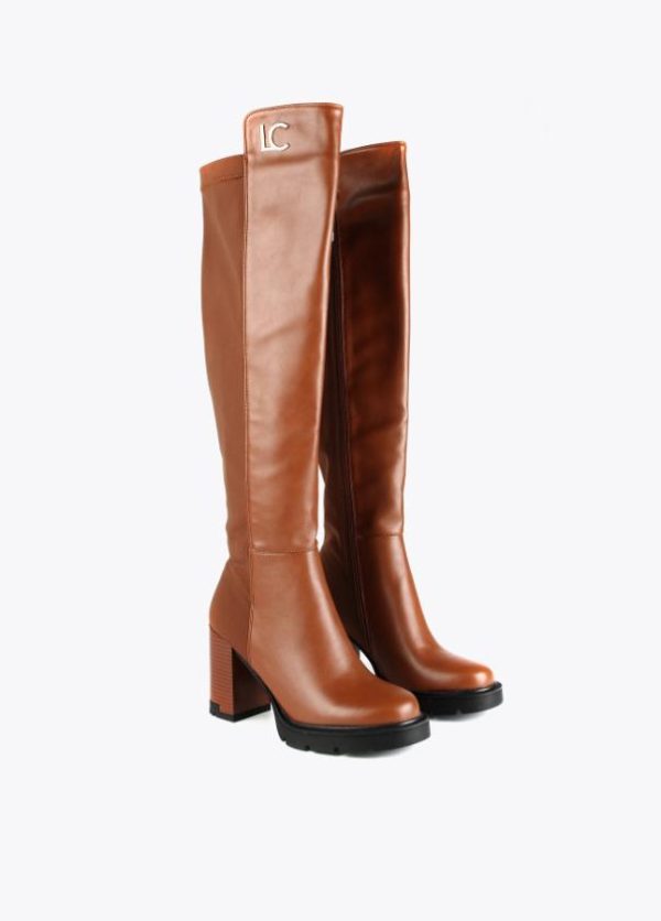 Botas tipo mosquetera altas con tacón en diferentes tejidos, efecto piel y efecto neopreno combinados. Maxi suela y logo dorado en parte superior.