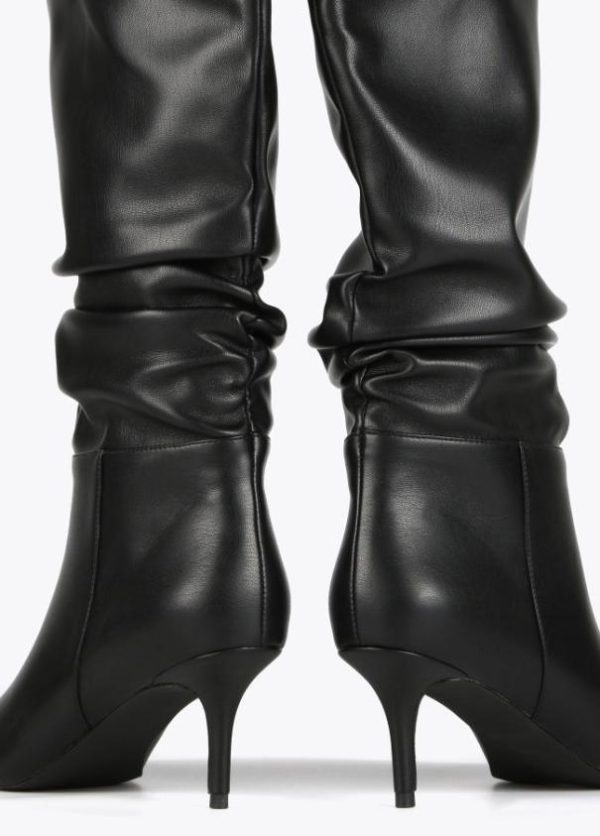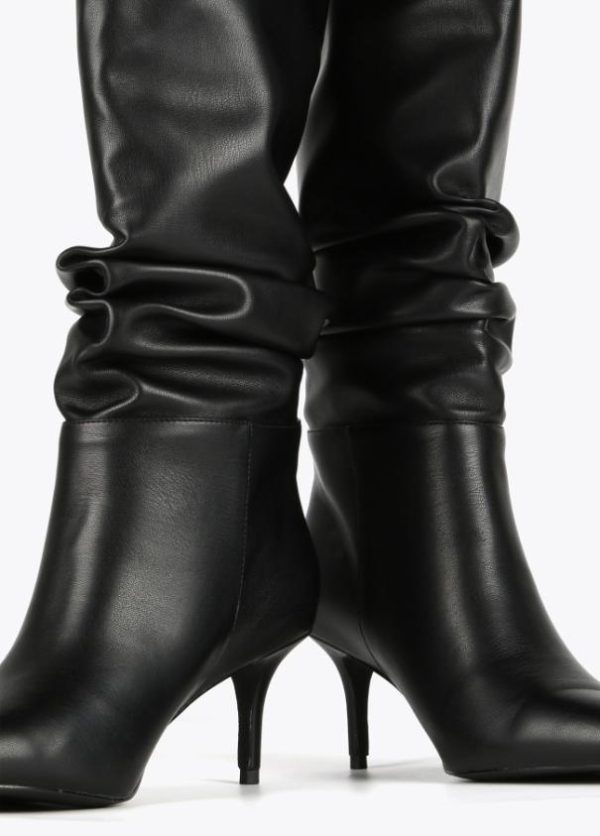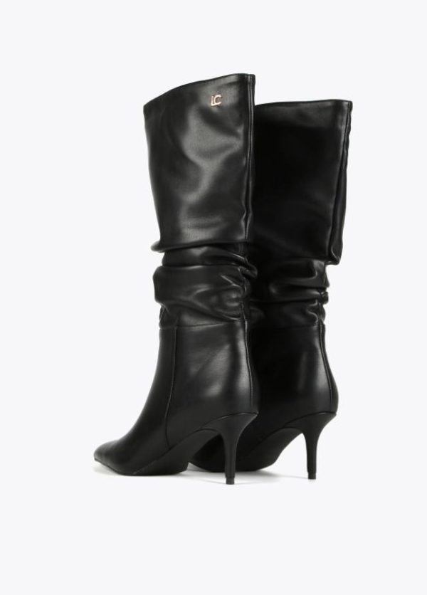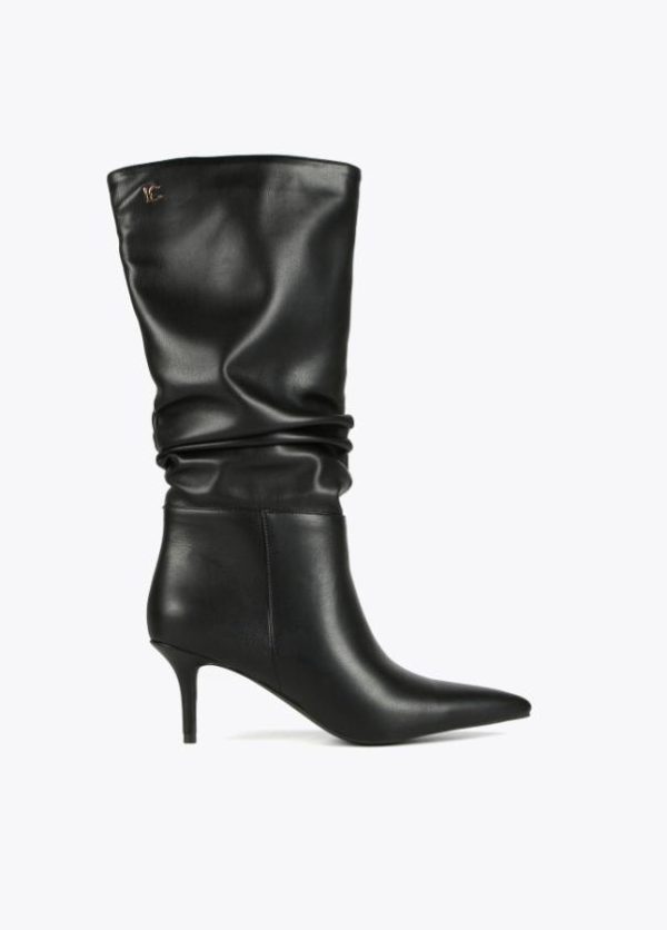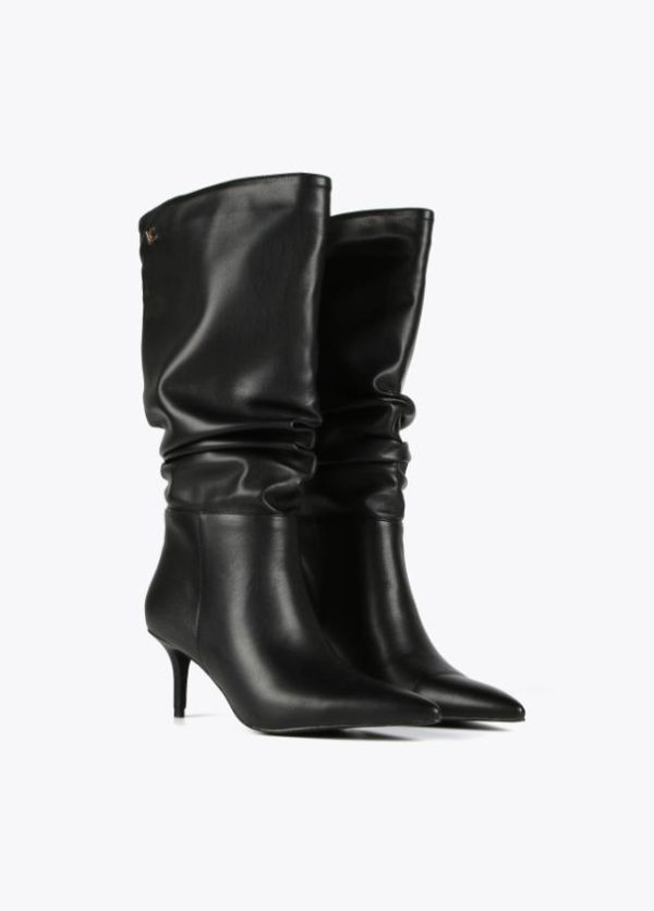 Bota negra de tacón fino. Caña fruncida y detalles de logo en lateral. Acabado en punta.