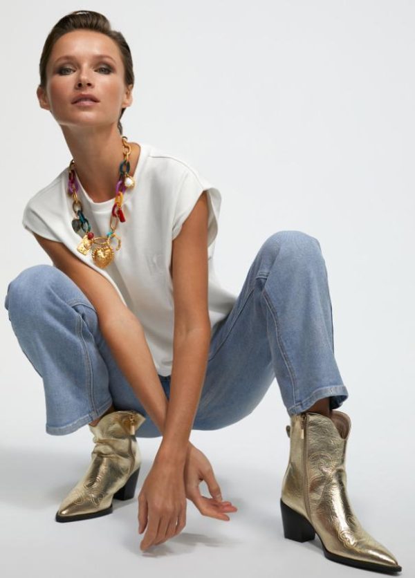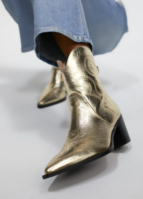 Botín estilo cowboy metalizado pespunteado y con cremallera en los laterales. Tira trasera logotipada y letras logo doradas.