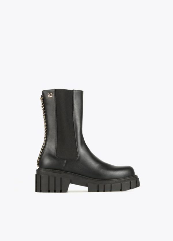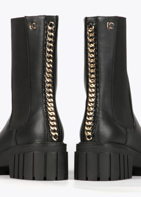 Botín negro con detalle cadena dorada en parte trasera y letras logo en lateral. Suela tipo track y cremallera lateral.