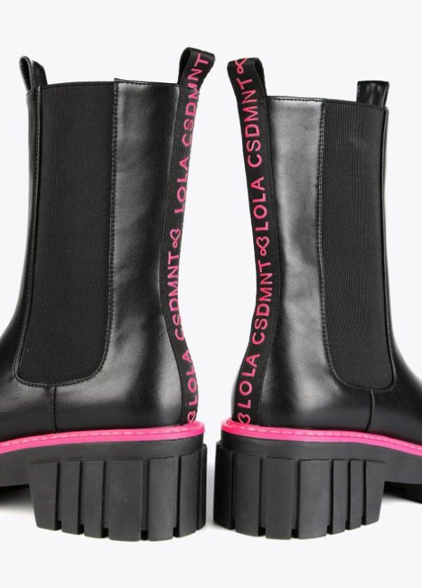 Botín en color negro con detalles en color fucsia. Detalle logo en parte trasera y goma ajustable en laterales.