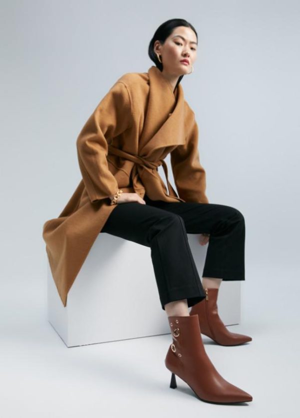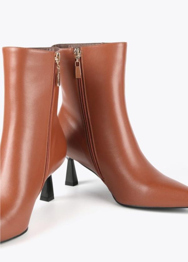 Botín de tacón efecto piel. Cierre con cremallera lateral y detalles de ojales dorados. Logo metalizado en parte trasera. Acabado en punta.