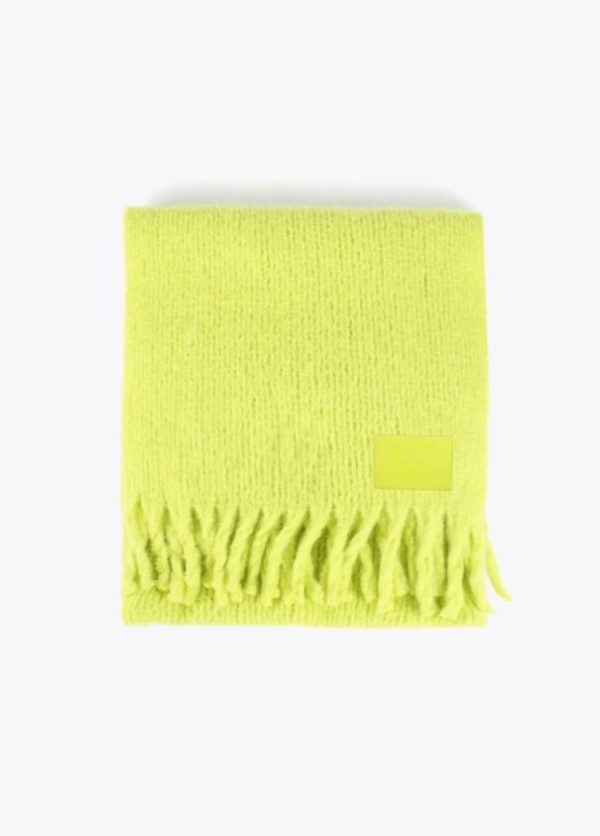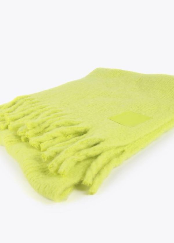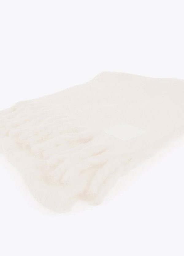 Bufanda unicolor con flecos en extremos y logo grabado sobre efecto piel.